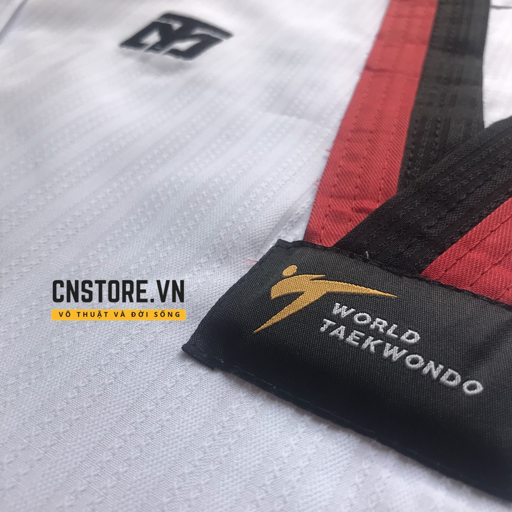 Võ Phục Taekwondo Mooto Cổ Đỏ Đen Vải Sọc Loại Tốt